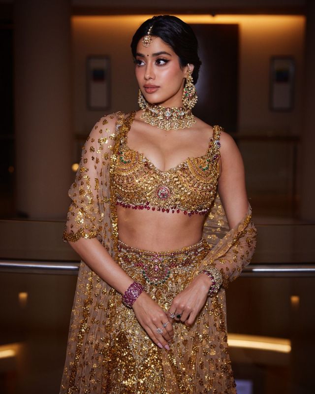 जान्हवी कपूर अपने शानदार सुनहरे लहंगे में शाही अंदाज़ में नज़र आईं। ब्रालेट-स्टाइल ब्लाउज़ में मंदिर के गहनों का इस्तेमाल करके जटिल सजावट की गई थी। अभिनेत्री ने इसे एक समान रूप से सुंदर लहंगे की स्कर्ट और ट्यूल दुपट्टे के साथ पहना था।