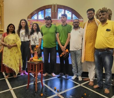Agra, Uttar Pradesh, India.आजादी के अमृत महोत्सव की श्रृंखला में नटरांजलि थिएटर आर्ट्स द्वारा आयोजित सातवें अंतर्राष्ट्रीय ताज रंग महोत्सव में आज काइरो, इजिप्ट के कलाकारों के साथ शिल्पग्राम के निकट रंगस्थली होटल ताज हवेली में प्राचीन कैलाश मंदिर के महंत गौरव गिरि ने मंत्रोच्चारण के साथ भूमि पूजन एवं नटराज पूजन किया। तत्पश्चात् इजिप्ट के कलाकारों को रक्षासूत्र बांध कर, रोली, चन्दन का टीका लगाकर स्वागत किया गया।