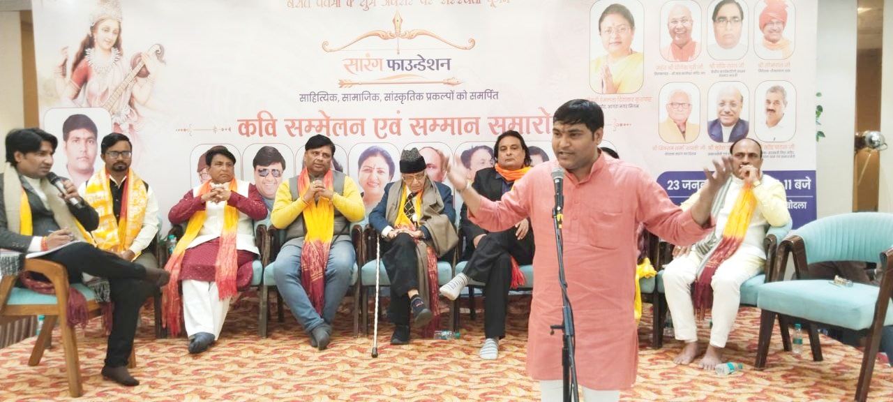 Agra, Uttar Pradesh, India, Bharat. साहित्यिक, सामाजिक व सांस्कृतिक प्रकल्पों को समर्पित सारंग फाउंडेशन ने 23 जनवरी को अपने प्रथम कार्यक्रम में इतिहास ही रच दिया। कवि सम्मेलन में देशभक्ति की ऐसा तूफान उठा कि लोग कविगण और श्रोता भारत माता की जाय, वंदे मातरम, जय श्रीराम की गूंज करते रहे। तन पर 80 घाव होने के बाद भी युद्धरत रहे महान वीर राणा सांगा पर सचिन दीक्षित की कविता ने रोंगटे खड़े कर दिए। राणा सांगा पर अनर्गल टिप्पणी करने वाले सांसद को बद्तमीज करार दिया गया।