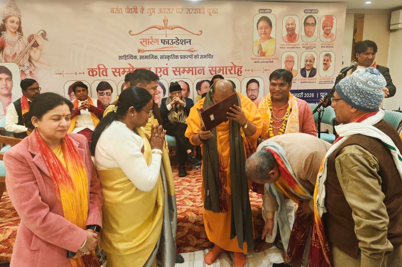 समारोह में मंच पर मौजूद अतिथियों ने शायर दीपांशु शम्स को सारंग युवा सम्मान-2026 के साथ-साथ सुप्रसिद्ध कवयित्री डॉ. ज्योत्स्ना शर्मा, रामेंद्र शर्मा रवि, संजय गुप्त, राकेश निर्मल, नूतन अग्रवाल, अलका अग्रवाल, बैंक अधिकारी और साहित्यवेत्ता सागर गुजराती, दीक्षा रिसाल, हरेंद्र शर्मा, मुकुल, रंजन मिश्र और प्रिया शुक्ला सहित 12 कवि- साहित्यकारों को सारंग सम्मान प्रदान किया। संचालन कवि पदम गौतम ने किया।