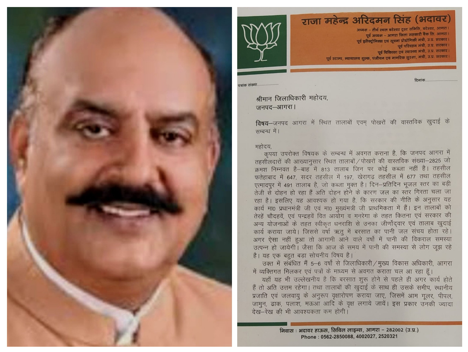 आगरा। विगत 5-6 वर्षों से आगरा जनपद के विभिन्न क्षेत्रों में स्थित कब्जा मुक्त तालाबों का जीर्णोद्धार करवाने के लिए प्राण-प्रण से प्रयासरत उत्तर प्रदेश सरकार के पूर्व कैबिनेट मंत्री राजा अरिदमन सिंह ने इस बार भी ग्रीष्मकाल के दस्तक देते ही पुनः इस मुद्दे को जनहित में उठाया है।