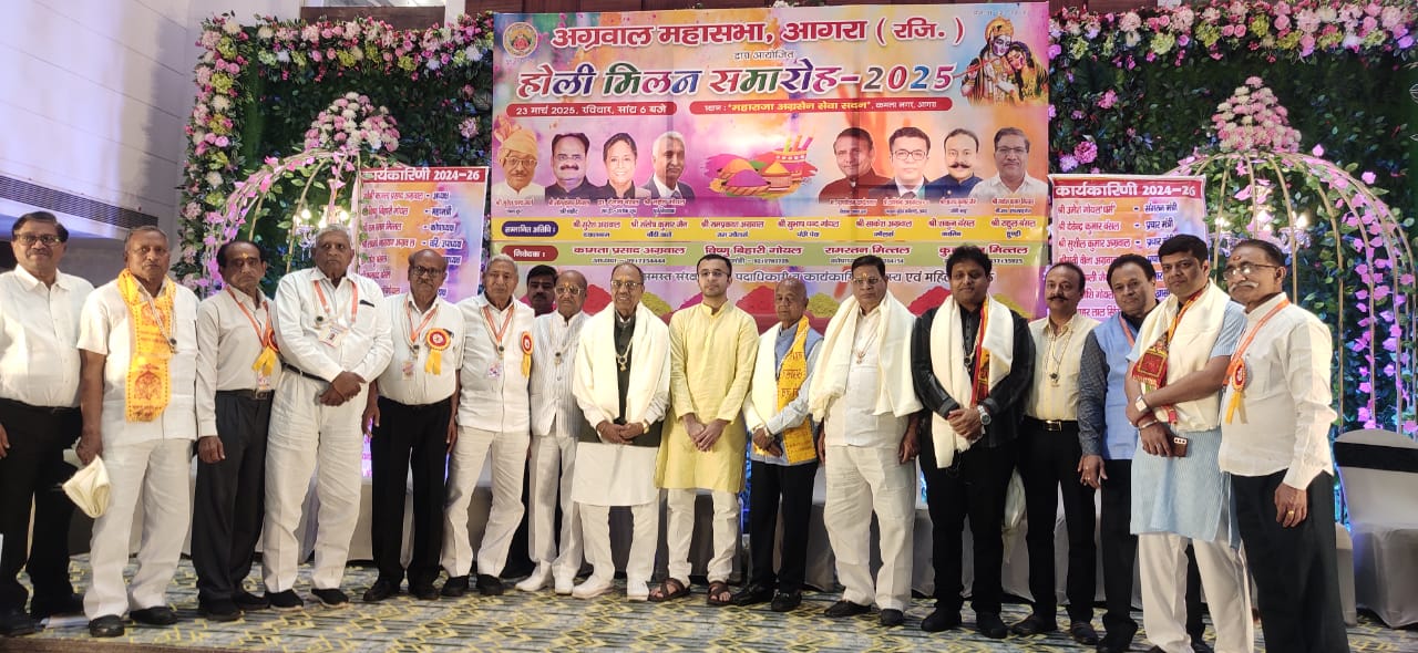आगरा। अग्रवाल महासभा के होली मिलन समारोह में गुलाल के साथ श्रीराधा-कृष्ण की भक्ति के रंग बिखरे। रादा-कृष्ण के जयकारों संग महाराजा अग्रसेन के जयकारे भी खूब गूंजे। फूलों की होली और वृन्दावन की मंडली के भक्तिमय फाग गीतों पर मस्ती, उत्साह और उमंग में हर सदस्य डूबा नजर आया। इस अवसर पर समाज सेवा में अग्रणी 100 अग्रबंधुओं को स्मृति चिन्ह प्रदान कर सम्मानित किया गया। अतिथियों का स्वागत माते पर चंदन लगाकर व पटका पहनाकर किया गया।