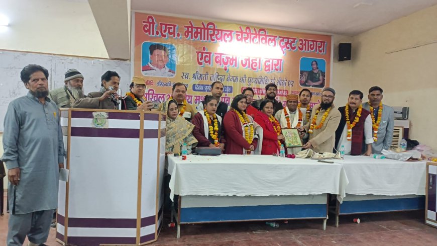 आगरा। विगत दिन यूथ हॉस्टल में बीएच मेमोरियल चेरिटेबिल ट्रस्ट आगरा एवं बज्म ए जहां के संयुक्त तत्वावधान में अंतर्राष्ट्रीय शायरा डॉ. आरिफा शबनम की मां मरहूम जाहिदा वेगम की बरसी के मौके पर देर रात चले मुशायरा/कवि सम्मेलन में सियायत और मुल्क की हिफाजत के ठेकेदारों पर खूब तंज कसे गए।