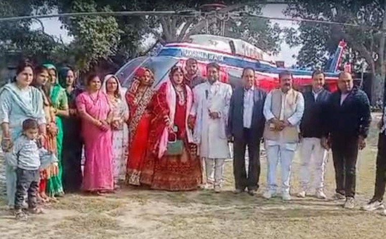 आगरा। चाहरबाटी क्षेत्र अकोला में तीन दिन पहले एक युवक अपनी दुल्हनिया को हेलीकॉप्टर से लेकर आया। चौधरी चरण सिंह महाविद्यालय के प्रांगण में यह हेलीकॉप्टर उतरा। दूल्हा विवेक चाहर और दुल्हन नेहा चौधरी के साथ हेलीकॉप्टर को देखने के लिए लोगों की भीड़ जुट गई।