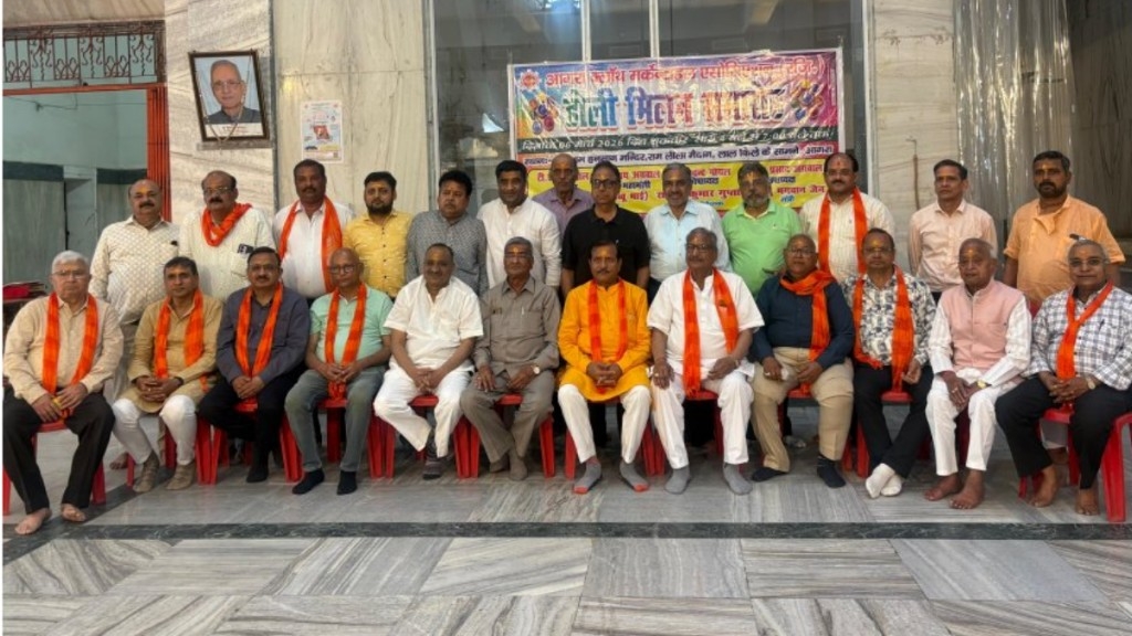 ​आगरा क्लॉथ मर्केंटाइल एसोसिएशन द्वारा रामलीला मैदान स्थित हनुमान मंदिर परिसर में भव्य होली मिलन समारोह आयोजित किया गया। कार्यक्रम का शुभारंभ मुख्य अतिथि विधायक पुरुषोत्तम खंडेलवाल ने हनुमान जी की आरती उतारकर किया। इस दौरान व्यापारियों ने पारंपरिक होली गीतों पर थिरकते हुए एक-दूसरे पर फूलों की वर्षा की और चंदन का तिलक लगाकर स्वागत किया। एसोसिएशन के अध्यक्ष टीएन अग्रवाल और महामंत्री संजय अग्रवाल ने व्यापारियों के बीच एकजुटता और प्रेम पर जोर दिया।