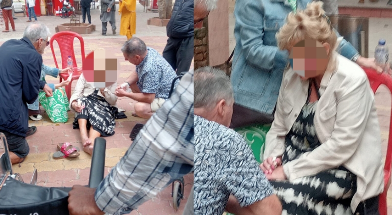 नीदरलैंड की महिला पर्यटक को ठोकर लगी तो गिरने से उसके पैर में लगी चोट से खून बहने लगा। आसपास के लोगों ने महिला को संभाला।