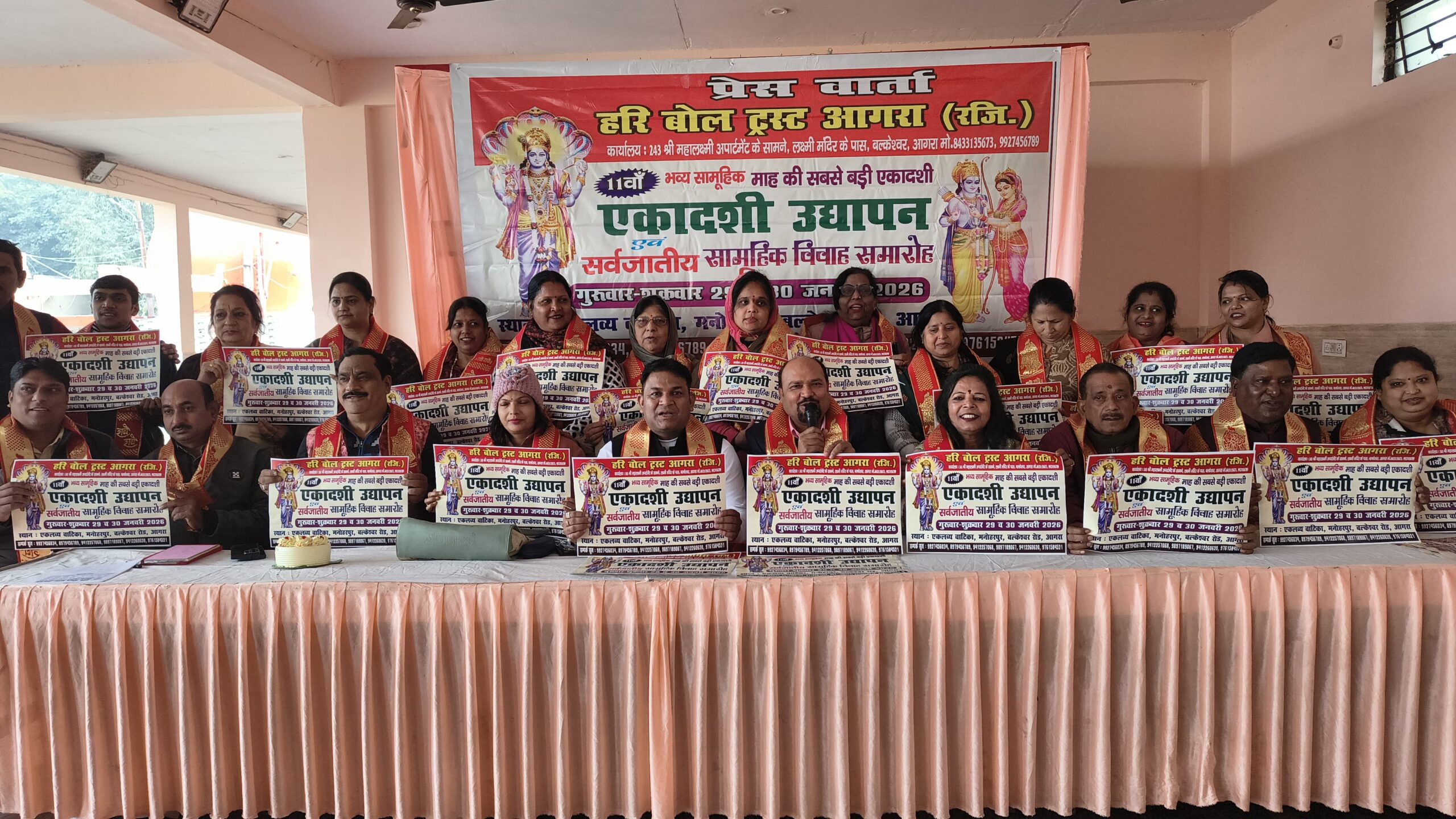आगरा। सामाजिक संस्था हरि बोल ट्रस्ट आगरा द्वारा 11वें भव्य सामूहिक एकादशी उद्यापन एवं सामूहिक विवाह समारोह का आयोजन 28 जनवरी से 30 जनवरी तक किया जाएगा। कार्यक्रम की जानकारी देने के लिए एकलव्य वाटिका, मनोहरपुरम, बल्केश्वर में आयोजित प्रेस कॉन्फ्रेंस में समारोह का पोस्टर विमोचन किया गया और शहरवासियों को आमंत्रित किया गया।