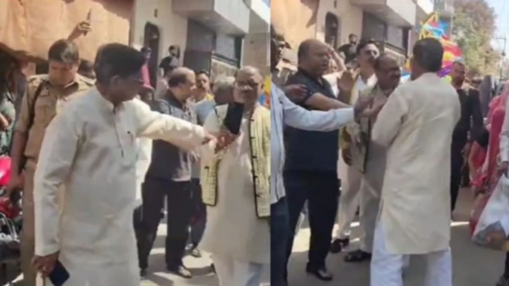 आगरा: यूपी के आगरा में एक लोकतंत्र रक्षक सेनानी की शवयात्रा के दौरान मंगलवार को भारतीय जनता पार्टी के विधायक डॉ. जीएस धर्मेश और भाजपा के ही पूर्व मंत्री व तीन बार के पूर्व विधायक रामबाबू हरित के बीच में हाथापाई की नौबत का वीडियो सामने आया है। यह वीडियो सोशल मीडिया पर तेजी से चर्चा का विषय बना।