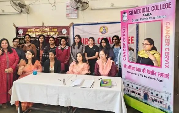 आगरा। अंतरराष्ट्रीय महिला दिवस के उपलक्ष्य में एस एन मेडिकल कॉलेज के प्रधानाचार्य डॉक्टर प्रशांत गुप्ता के मार्गदर्शन में स्त्री एवं प्रसूति रोग विभाग द्वारा सर्वाइकल कैंसर वैक्सीन के कैम्प का आयोजन 6 मार्च को गर्ल्स हॉस्टल में किया गया। मेडिकल कॉलेज के स्त्री एवं प्रसूति रोग विभाग की आचार्य एवं विभाग अध्यक्ष प्रोफेसर ऋचा सिंह ने बच्चियों को वैक्सीन लगवाने की सलाह दी।