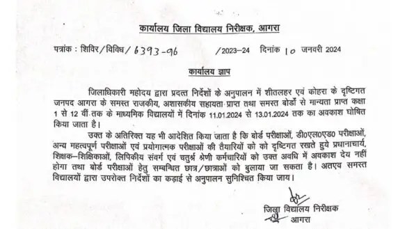 आपको बता दे चलें कि इस समय गलन भरी सर्दी से सभी की मुश्किलें बढ़ गयी है। पिछले कई दिनों से आगरा में गलन बनी हुई थी। बुधवार को सूर्य देव के सुबह ही दर्शन हुए और शाम तक होते रहे। धूप भी निकल आई लेकिन सर्द हवाओं ने गलन को बरकरार रखा। ऐसे में जिला प्रशासन ने एक बार फिर बच्चों के अवकाश में बढ़ोतरी कर दी। कक्षा 1 से 12 तक के विद्यालयों की छुट्टी बढ़ा दी गयी। अब सभी विद्यालय 13 जनवरी तक बंद रहेंगे तो वहीँ 14 जनवरी को संक्रांति की छुट्टी रहेगी। अब स्कूल 15 को ही खुलेंगे।