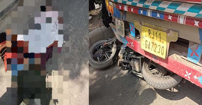 पीछे से तेज गति से आ रहे ट्रक ने बाइक सवार पिता-पुत्र को अपनी चपेट में ले लिया। बाइक ट्रक के नीचे उलझ गई और पिता-पुत्र की लाशें फंस गईं।