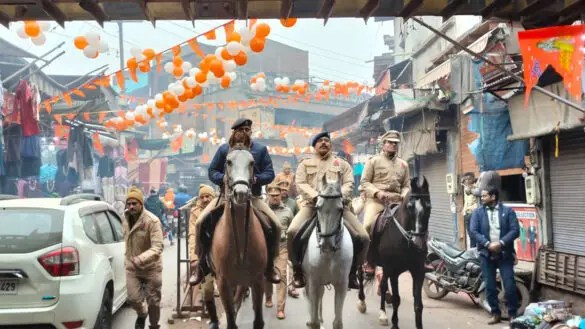 आज आगरा पुलिस ने घोड़े पर सवार होकर संवेदनशील इलाकों में गश्त किया। मुस्लिम इलाकों में जब घोड़े पर सवार होकर डीसीपी सिटी सूरज राय निकले तो लोग पुलिस की गश्त को अपने कैमरे में कैद करते हुए नजर आए, साथ ही साथ एक हज़ार से अधिक पुलिसकर्मी उनके साथ में मौजूद रहे। इस दौरान उन्होंने संवेदनशील इलाकों में गश्त किया और वहां पर लोगों बातचीत की। डीसीपी सिटी सूरज राय ने बताया कि प्रभु श्री राम की प्राण प्रतिष्ठा को लेकर आगरा पुलिस चौकन्ना एवं चौकस है। चप्पे चप्पे पर पुलिस द्वारा पैनी नज़र रखी जा रही है। उन्होंने बताया कि आज विशेष दिन को शांतिपूर्वक संपन्न करने के लिए आगरा शहर को 6 जॉन और 18 सेक्टर में बांटा गया है। मिश्रित आबादी, संवेदनशील इलाकों में पुलिस का कड़ा पहरा है, वही अफवाह पर ध्यान न देने की डीसीपी सिटी ने सभी से अपील भी की है।