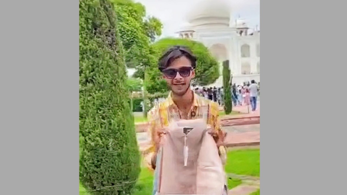 वीडियो में ताजमहल के उद्यान में युवक कपड़ों का प्रचार करता दिखाई दे रहा है। करीब 31 सेकेंड के वीडियो में युवक तीन-चार शर्ट्स दिखाते हुए पांच सौ रुपये में चार शर्ट का ऑफर देता नजर आ रहा है।