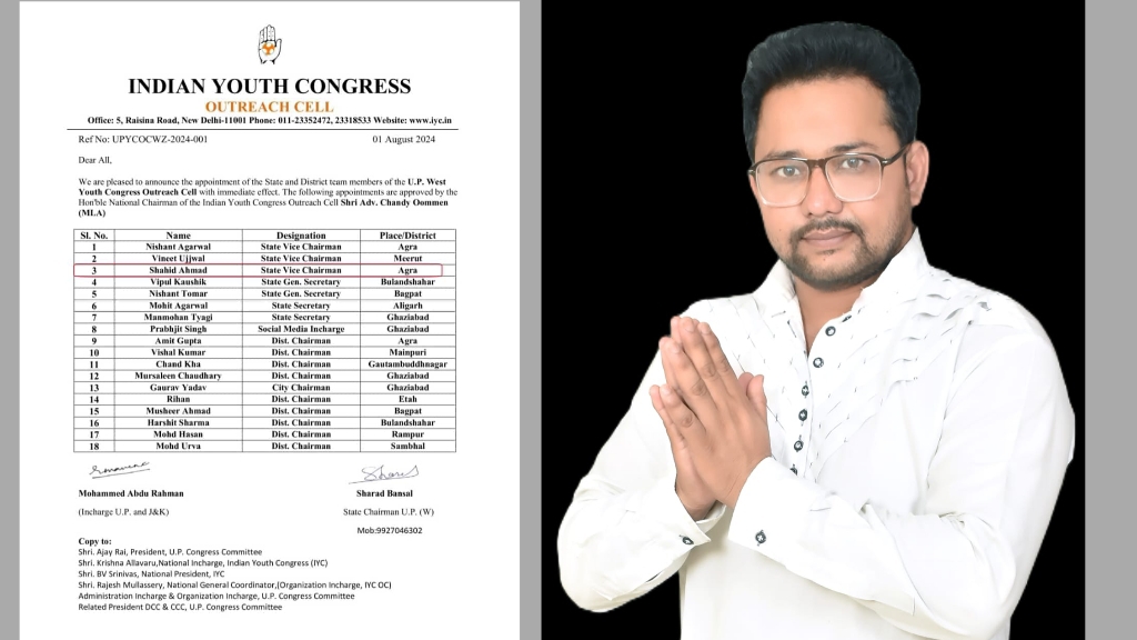 आगरा: शाहिद अहमद को भारतीय युवा कांग्रेस आउटरीच सेल का प्रदेश उपाध्यक्ष बनाया गया है। इसकी घोषणा भारतीय युवा कांग्रेस आउटरीच के राष्ट्रीय अध्यक्ष चांडी ओमन , जोनल इंचार्ज मो. अबु रहमान एवं भारतीय युवा कांग्रेस आउटरीच सेल के प्रदेश इंचार्ज शरद बंसल ने संयुक्त रुप से की है। शाहिद अहमद जिला कार्यकर्ता एवं सामाजिक कार्यकर्ता की हैसियत से राजनीति में कदम रखा था। पूर्व में भी शाहिद अहमद कांग्रेस में कई पदों पर अपनी जिम्मेदारी निभा चुके है ।