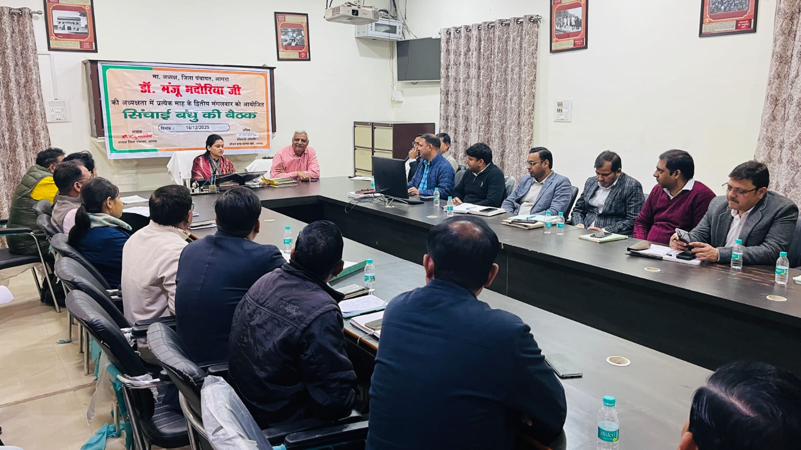 आगरा। जनपद में सिंचाई, विद्युत आपूर्ति और कृषि से जुड़ी योजनाओं की समीक्षा को लेकर मंगलवार को जिला पंचायत सभागार में सिंचाई बंधु की बैठक आयोजित की गई। बैठक की अध्यक्षता जिला पंचायत अध्यक्ष श्रीमती मंजू भदौरिया ने की। बैठक में नहरों की सिल्ट सफाई, विद्युत आपूर्ति, नलकूप, कृषि योजनाओं और किसान हित से जुड़े विभिन्न मुद्दों पर विस्तार से चर्चा की गई।