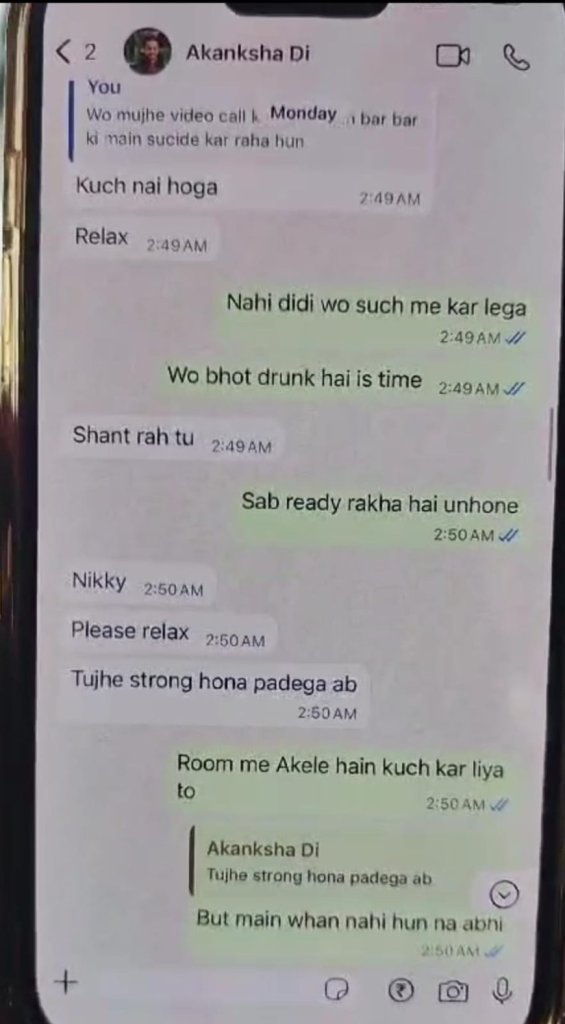 निकिता का कहना है कि मानव लाइव फंदा डाले हुए थे। तब भी मैंने उनके पापा को मैसेज किया कि मानव के कमरे में जाकर देख लो। उनकी बहन को काॊल किया। मैसेज किए, लेेकिन उन्होंने यह कहकर चुप करा दिया था कि मेरी बात हो गई है, वह कुछ नहीं करेगा।