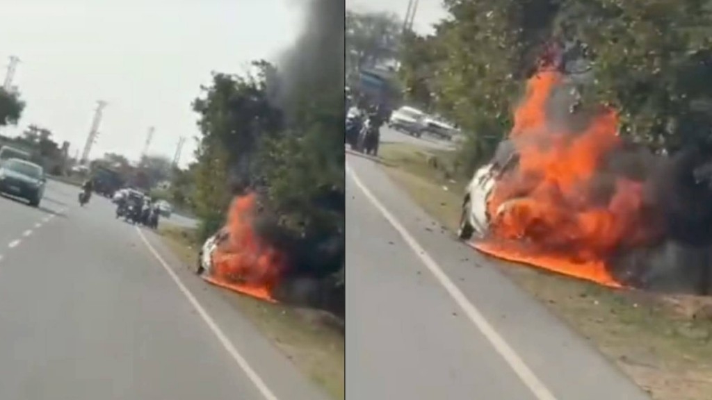 सूचना पर पहुंची पुलिस और फायर ब्रिगेड की टीम ने कड़ी मशक्कत के बाद आग पर काबू पाया। हालांकि, तब तक कार पूरी तरह जलकर खाक हो चुकी थी। इस घटना के कारण हाईवे पर काफी देर तक ट्रैफिक जाम की स्थिति बनी रही। पुलिस मामले की विस्तृत जांच कर रही है।