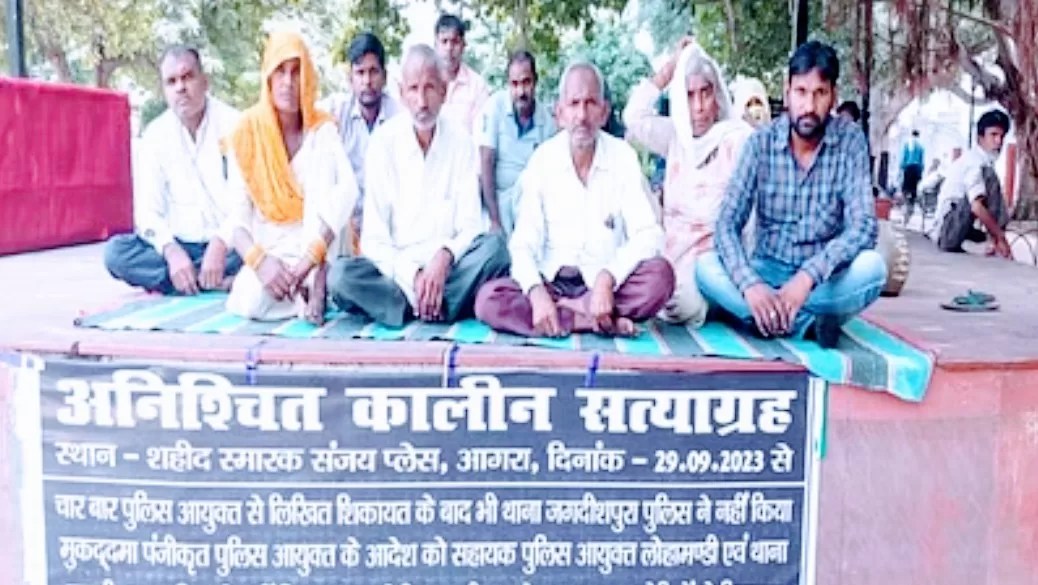 आगरा: जिले के ग्राम लड़ामदा का एक परिवार दोहरी पीड़ा लिए शहीद स्मारक पर भूख हड़ताल पर बैठा है। परिवार का कहना है कि पुलिस ने झगड़े के मामले में एकपक्षीय कार्रवाई की। विपक्षीगणों ने पहले उनके साथ मारपीट की और फिर पहले थाने पहुंचकर झूठा मुकदमा भी लिखा दिया। उनकी शिकायत पर केस दर्ज नहीं किया।