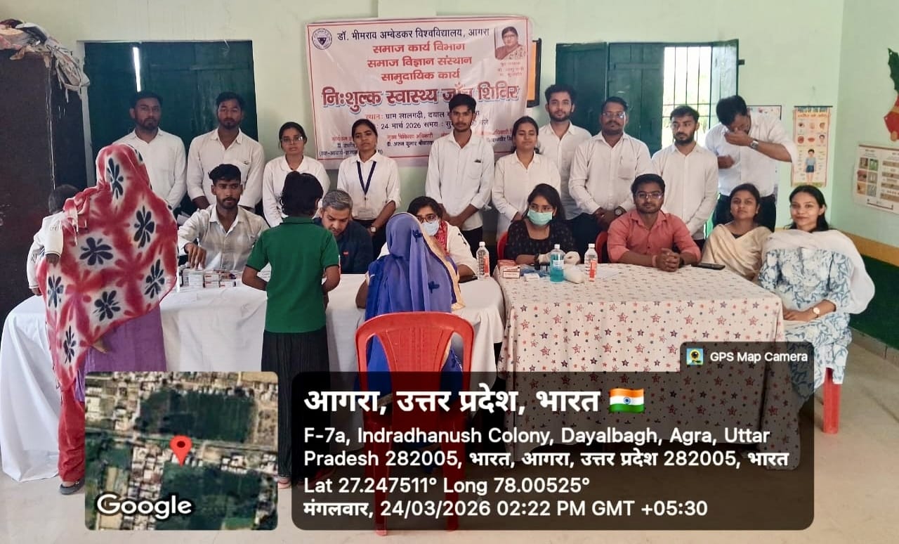 आगरा: डॉ. भीमराव अंबेडकर विश्वविद्यालय के समाज कार्य (M.S.W.) द्वितीय सेमेस्टर के छात्र-छात्राओं ने अपनी शैक्षणिक शिक्षा को धरातल पर उतारते हुए दयालबाग क्षेत्र के ग्राम लालघड़ी में एक विशाल निःशुल्क स्वास्थ्य शिविर का आयोजन किया। विश्वविद्यालय की कुलपति डॉ. आशु रानी के कुशल निर्देशन और पर्यवेक्षक डॉ. राजीव वर्मा के मार्गदर्शन में यह कार्यक्रम सफलतापूर्वक संपन्न हुआ।