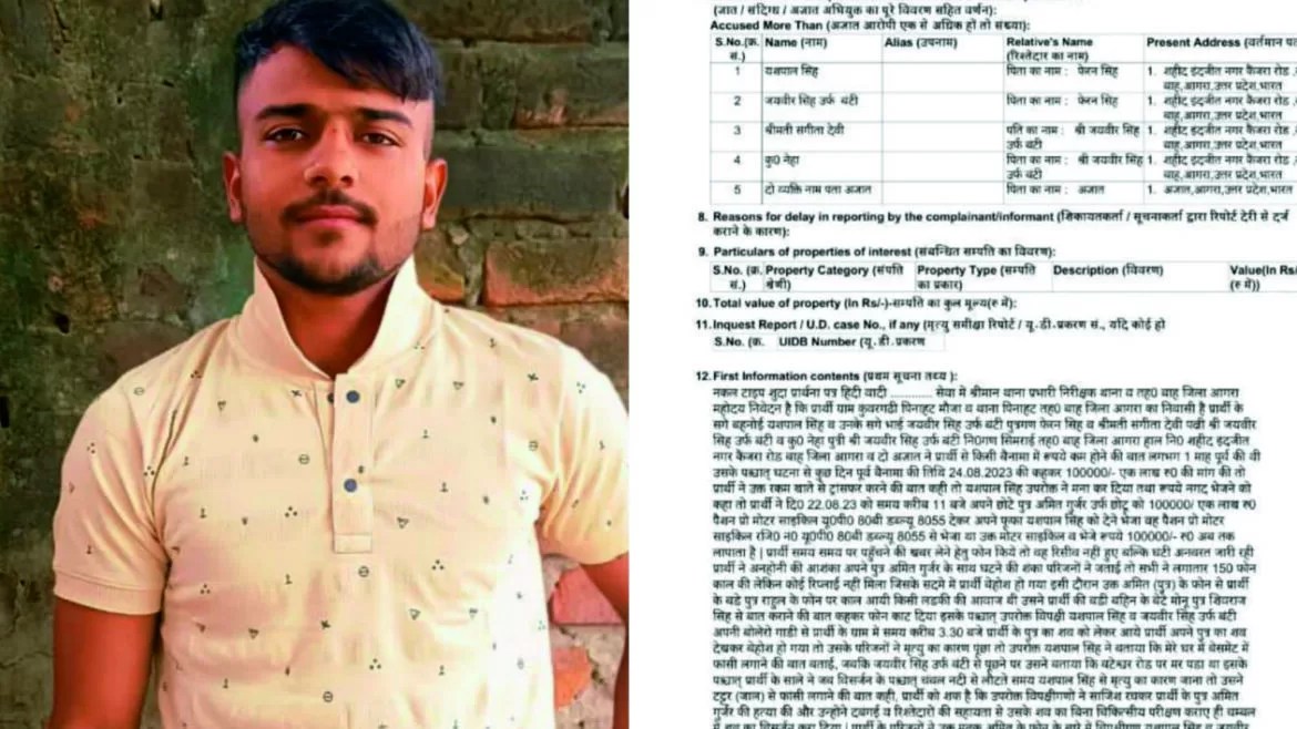 आगरा। कस्बा बाह के कैंजरा मार्ग स्थित शहीद इंद्रजीत नगर केंजरा मार्ग में एक सप्ताह पूर्व युवक अमित उर्फ छोटू पुत्र निमेंद्र सिंह निवासी कुंवर घड़ी थाना पिनाहट अपनी बुआ के घर फूफा को रुपए देने के लिए गया था। जहां संदिग्ध परिस्थितियों में युवक की अचानक मौत हो गई थी। पिता निमेंद्र सिंह का आरोप है कि उनके रिश्तेदार बहनोई यशपाल सिंह एवं उनका छोटा भाई जयवीर सिंह पुत्रगण फेरन सिंह ने ही उनके बेटे की हत्या की है।