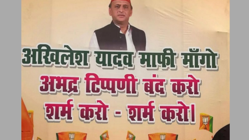 लखनऊ के 1090 चौराहे पर भाजपा नेता अच्युत पांडेय ने होर्डिंग में सपा अध्यक्ष अखिलेश यादव की तस्वीर लगाते हुए लिखा है कि ‘अखिलेश यादव माफी मांगो, अभद्र टिप्पणी बन्द करो’। इसके साथ ही होर्डिंग में आगे लिखा गया है कि ‘शर्म करो… शर्म करो’। ये होर्डिंग अब सोशल मीडिया पर तेजी के साथ वायरल हो रही है। बता दें कि अच्युत पांडे ने ही इस मामले में बीते शनिवार को सबसे पहले हजरतगंज थाने में समाजवादी मीडिया सेल के खिलाफ तहरीर दी गयी थी।