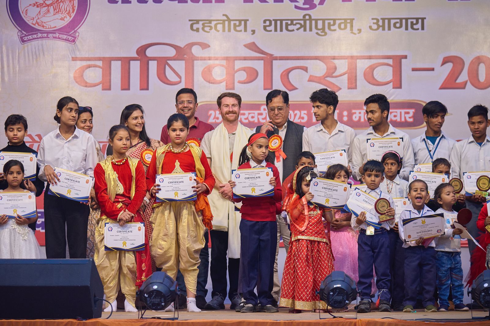 आगरा। नित्य, नाट्य और संगीत की एक से बढ़कर एक मनमोहक प्रस्तुति के बीच छात्र-छात्राओं की प्रतिभा और रचनात्मकता का अद्भुत प्रदर्शन, मौका था सरस्वती शिशु विद्या मंदिर, शास्त्रीपुरम के वार्षिकोत्सव का। जिसका शुभारम्भ किशोर शक्ति फाउंडेशन एवं किशोर एक्सपोर्ट्स के दीपक अग्रवाल एवं साक्षी अग्रवाल, विद्या भारती प्रांत संगठन मंत्री हरीशंकर और मुख्य वक्ता शिशु शिक्षा समिति के सहमंत्री रविकान्त चावला ने संयुक्त रूप से किया। अतिथियों का स्वागत विद्यालय समिति के अध्यक्ष वीरेन्द्र अग्रवाल, प्रबन्धक संजय मिश्र, प्रधानाचार्य हरिओम सिंह ने किया।
