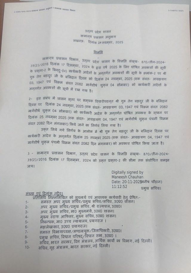 मुख्यमंत्री योगी आदित्यनाथ ने अवकाश की नई तारीख की घोषणा की, जिसके बाद प्रमुख सचिव मनीष चौहान ने इस संबंध में आधिकारिक आदेश जारी किया। आदेश में कहा गया है कि 24 नवंबर (सोमवार) को पड़ने वाले गुरु तेग बहादुर बलिदान दिवस का अवकाश अब एक दिन बाद, यानी 25 नवंबर को मनाया जाएगा।