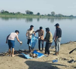 Agra, Uttar Pradesh, India. अखिल भारतीय विद्यार्थी परिषद आगरा महानगर की सिकंदरा नगर इकाई दवारा श्री छत्रपति शिवाजी महाराज जी की पुण्यतिथि के अवसर पर विकासार्थ विद्यार्थी (SFD) द्वारा कैलाश मंदिर यमुना घाट पर स्वच्छता अभियान चला कर नमन किया। कार्यकर्ताओं ने नदी के तट पर प्लास्टिक,पुराने कपड़े जैसा अन्य कचरा उठाया और डस्टबिन तक पहुंचाया।