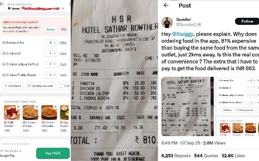 7 सितंबर को, सुंदर (@SunderjiJB) नाम के एक यूज़र ने ‘X’ पर एक पोस्ट शेयर की, जिसने इंटरनेट पर हंगामा मचा दिया। उन्होंने स्विगी को टैग करते हुए सवाल किया कि रेस्टोरेंट से सीधे खाना लेने पर जो बिल ₹810 का था, वही खाना ऐप से ऑर्डर करने पर ₹1473 का क्यों पड़ा? यह 81% का चौंकाने वाला फ़र्क़ था, जबकि रेस्टोरेंट उनके घर से सिर्फ़ दो किलोमीटर दूर था। इस पोस्ट को 10 लाख से ज़्यादा व्यूज़ और 17 हज़ार से ज़्यादा लाइक्स मिले, जो यह दिखाता है कि यह सिर्फ़ एक व्यक्ति की समस्या नहीं, बल्कि एक साझा अनुभव है।