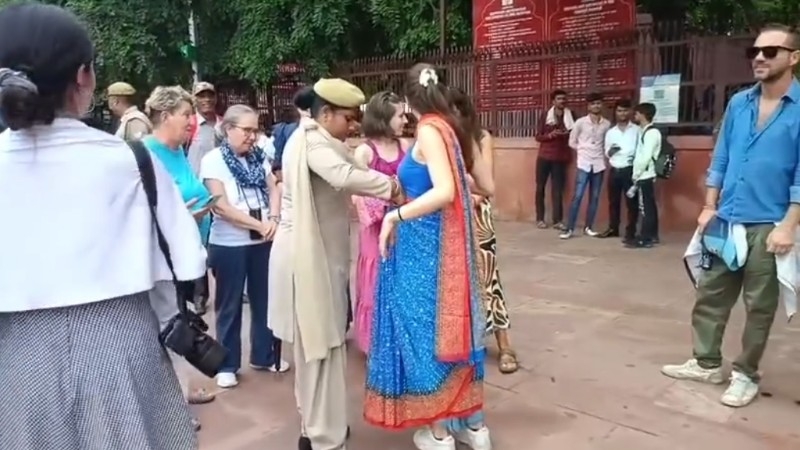 सिपाही ने उन्हें साड़ी पहनना सिखाया। इसके बाद दोनों पर्यटकों ने उनसे हाथ मिलाया और उन्हें थैंक्यू बोला। कहा- इट्स अमेजिंग ड्रेस। मुझे साड़ी पहनना अच्छा लगता है। इंडिया की यह वंडरफुल ड्रेस है। इसमें वह कंफर्टेबल फील करती हैं। मामला रविवार दोपहर ताजमहल के पश्चिमी गेट का है।