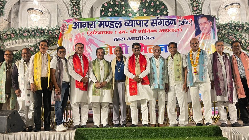 आगरा मण्डल व्यापार संगठन की ओर से प्रतापपुरा स्थित ‘द रमाना ग्रैंड होटल’ में भव्य होली मिलन एवं सम्मान समारोह आयोजित किया गया। कार्यक्रम का शुभारंभ मुख्य अतिथि विधायक पुरुषोत्तम खंडेलवाल ने दीप प्रज्ज्वलित कर किया। संगठन के अध्यक्ष पवन बंसल ने अतिथियों का स्वागत करते हुए व्यापारिक एकता पर जोर दिया।