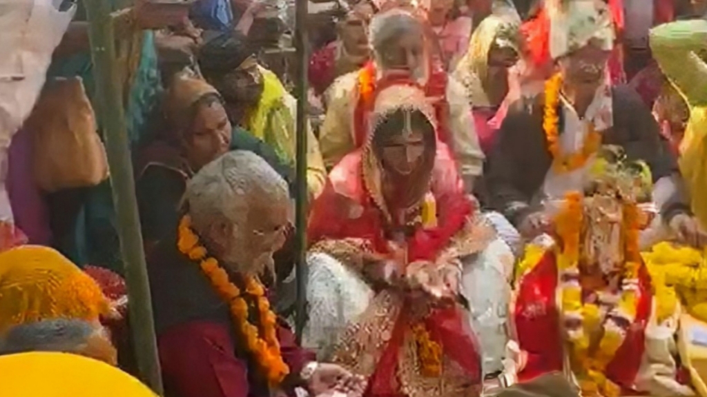 ईश भक्ति के एक निराले मामले में यहां करीब 25 वर्षीया युवती ने श्रीकृष्ण की मूर्ति के साथ विवाह रचा लिया। इस विवाह में सभी मंगल कार्य विधि-विधान से सम्पन्न हुए और सैकड़ों लोग इस विवाह के साक्षी बने। बाकायदा ठाकुर जी दूल्हा बने और 25 साल की रुक्मिणी दुल्हन बनी। बग्घी में श्रीकृष्ण के विग्रह को विराजमान कराया गया। बैंड बाजों की धुन पर बाराती खूब नाचे। विवाह के साथ कन्यादान हुआ।
