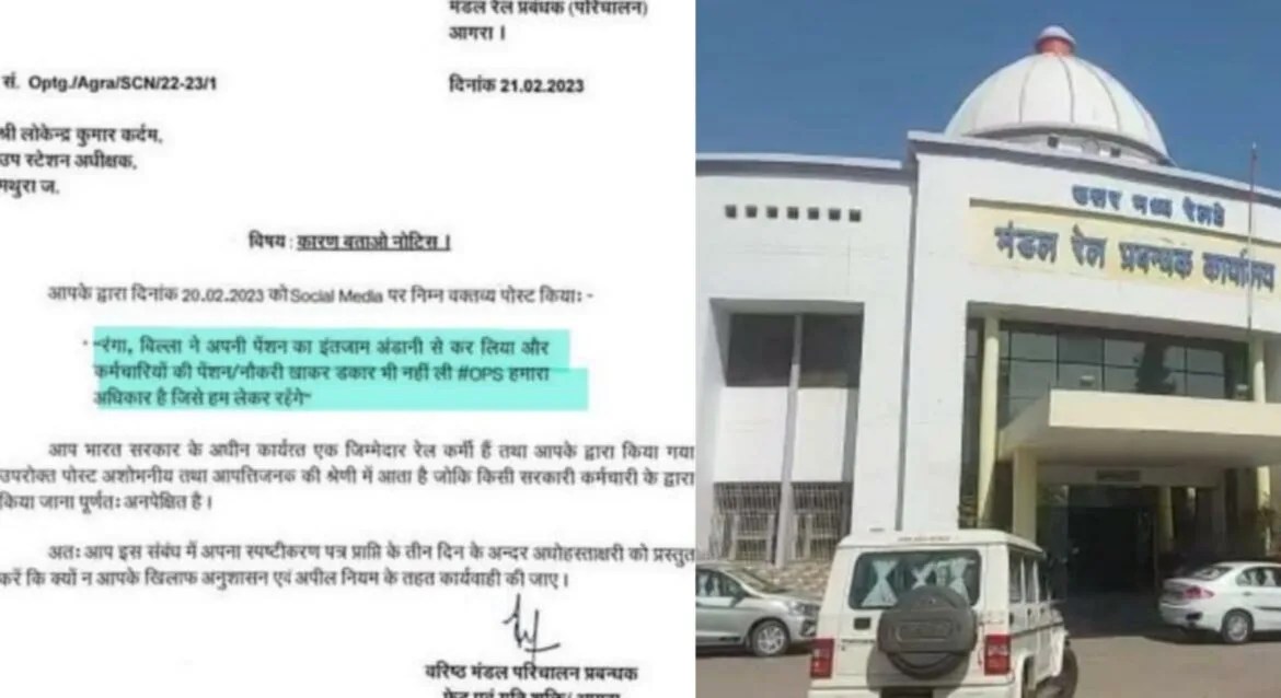 आगरा रेल मंडल मथुरा जंक्शन के उप स्टेशन अधीक्षक लोकेंद्र कुमार कर्दम ने 20 फरवरी को सोशल मीडिया पर एक वक्तव्य पोस्ट किया था। जिसमें लिखा था “रंगा और बिल्ला ने अपनी पेंशन का इंतजाम अडानी से कर लिया है और कर्मचारियों की पेंशन/नौकरी खाकर डकार भी नहीं ली। OPS हमारा अधिकार है जिसे हम लेकर रहेंगे।” इस विवादित पोस्ट के अपडेट होते ही यह पोस्ट तेजी के साथ वायरल हुई। आगरा रेल मंडल के अधिकारियों को इस संबंध में जानकारी हुई तो रेलवे में भी हड़कंप मच गया। उप स्टेशन अधीक्षक लोकेंद्र कुमार को तुरंत कारण बताओ नोटिस जारी कर दिया गया।