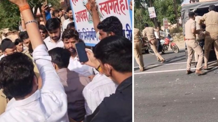 आगरा। आगरा में शमसाबाद रोड स्थित नौफरी गांव में मंगलवार को उस वक्त हड़कंप मच गया, जब करणी सेना के युवा राष्ट्रीय अध्यक्ष ओकेंद्र राणा पुलिस को चकमा देकर फिल्मी स्टाइल में फरार हो गए। पुलिस ने कार्यक्रम रोकने की कोशिश की, लेकिन वहां मौजूद लोगों के विरोध के चलते हालात बेकाबू हो गए। पुलिस और ओकेंद्र समर्थकों के बीच जमकर नोकझोंक और धक्का-मुक्की हुई। इसके बाद पुलिस ने लाठीचार्ज भी कर दिया। मौके से कई लोगों को गिरफ्तार कर लिया गया है।
