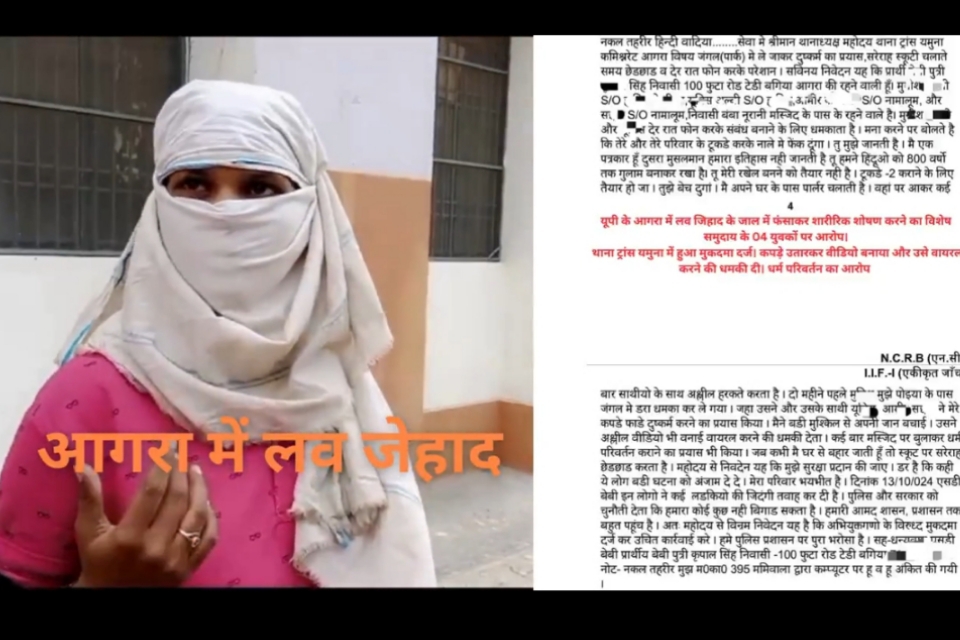 आगरा के थाना ट्रांस यमुना क्षेत्र में एक युवती ने चार युवकों के खिलाफ लव जिहाद का आरोप लगाते हुए दुष्कर्म और ब्लैकमेल का मामला दर्ज कराया है। पीड़िता का आरोप है कि आरोपी युवकों ने उसे प्रेम जाल में फंसाकर शारीरिक शोषण किया और उसके साथ दुष्कर्म का प्रयास किया। इसके अलावा, आरोपियों ने पीड़िता के कपड़े उतारकर वीडियो बनाया और उसे वायरल करने की धमकी दी।