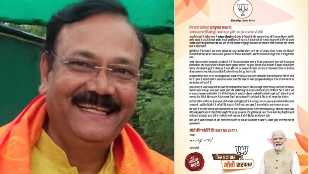 आगरा। भारत के प्रधानमंत्री नरेंद्र मोदी ने फतेहपुर सीकरी लोकसभा क्षेत्र से सांसद और भारतीय जनता पार्टी के प्रत्याशी राजकुमार चाहर के नाम एक पत्र लिखा है।