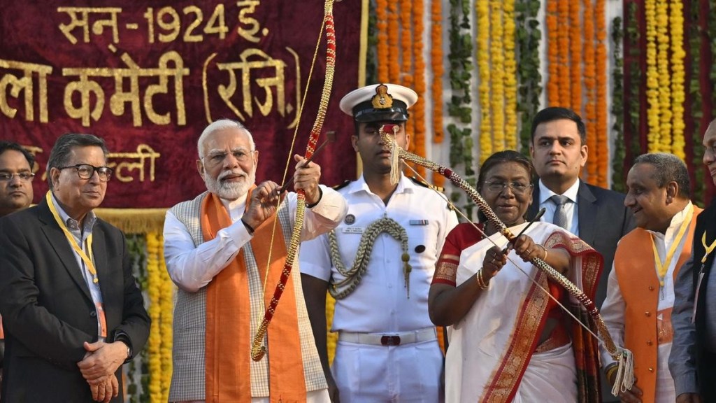 ”विजयदशमी के मौके पर राष्ट्रपति द्रौपदी मुर्मू और प्रधानमंत्री नरेंद्र मोदी दिल्ली के लाल किले पर रामलीला में पहुंचे। दोनों ने प्रतीकात्मक तीर चलाकर रावण दहन किया।सबसे पहले मंच पर पीएम मोदी और राष्ट्रपति मुर्मू पहुंची और भगवान राम और लक्ष्मण का किरदार निभा रहे युवाओं का तिलक कर उनकी पूजा की।