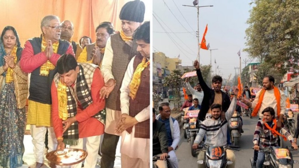 रैली में सैकड़ों युवाओं ने हाथों में देवकीनंदन ठाकुर जी के फोटो की तख्तियां और भगवा पताकाएं लेकर “जय श्रीराम” के गगनभेदी नारे लगाए। सामाजिक कार्यकर्ता विनीत शर्मा ने भगवा पताका लहराकर रैली को रवाना किया।