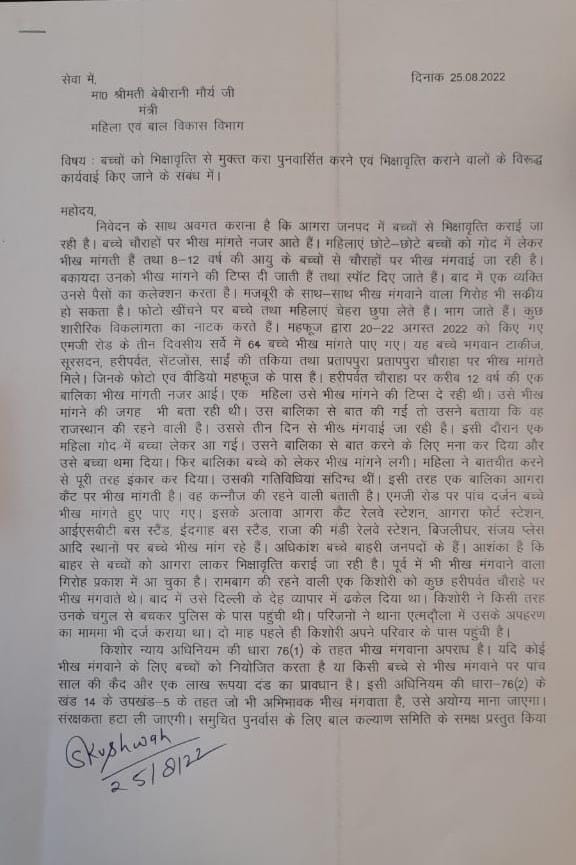 चौराहों पर लगे स्मार्ट सिटी के सीसीटीवी कैमरों से इनकी निगरानी की जाए। जिससे बच्चे दुबारा भिक्षावृत्ति में संलिप्त न हो सकें। आगरा भिक्षावृत्ति मुक्त हो सके। सर्वे के दौरान नरेश पारस के साथ वालंटियर प्राची अग्रवाल और नितिन शुक्ला उपस्थित रहे।