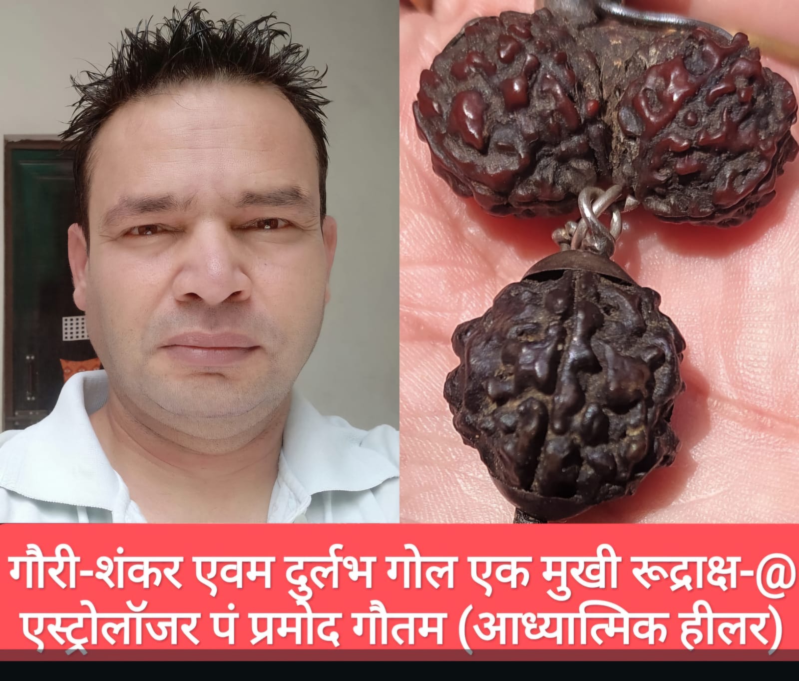 पंडित प्रमोद गौतम एवं उनके पास गौरीशंकर एवं दुर्लभ गोल एक मुखी रुद्राक्ष