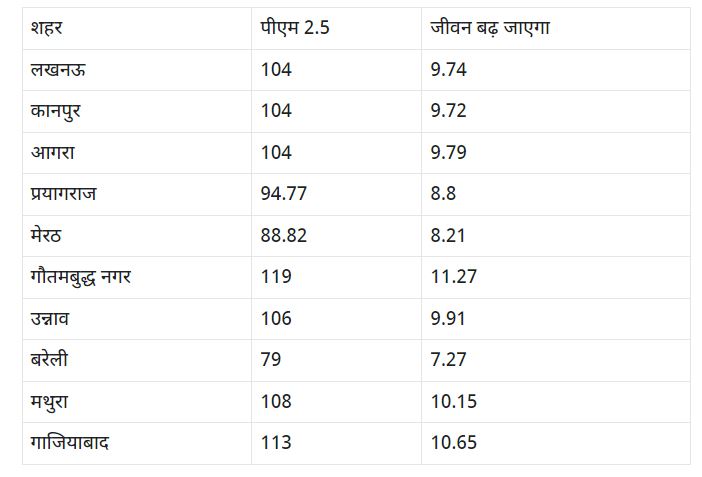 देश के अन्य राज्यों की तुलना में यूपी की वायु गुणवत्ता (Air Quality) दिल्ली के बाद सबसे खराब है। अगर विश्व स्वास्थ्य संगठन (WHO)के पीएम 2.5 मानक पांच के बराबर वायु गुणवत्ता (Air Quality) का स्तर आ जाए तो यूपी के लोगों की औसत आयु करीब 8.8 साल बढ़ जाएगी। अगर राष्ट्रीय मानक 40 के बराबर ले आएं तो उम्र करीब 5 साल बढ़ जाएगी। इन्हीं मानकों को यूपी के दस प्रमुख शहरों को रखने पर हालात और भयावह दिखते हैं। उत्तर प्रदेश की बात करें तो सबसे खराब स्थिति गौतम बुद्ध नगर की है। इससे सटे मथुरा और गाजियाबाद की हवा भी जहरीली है।