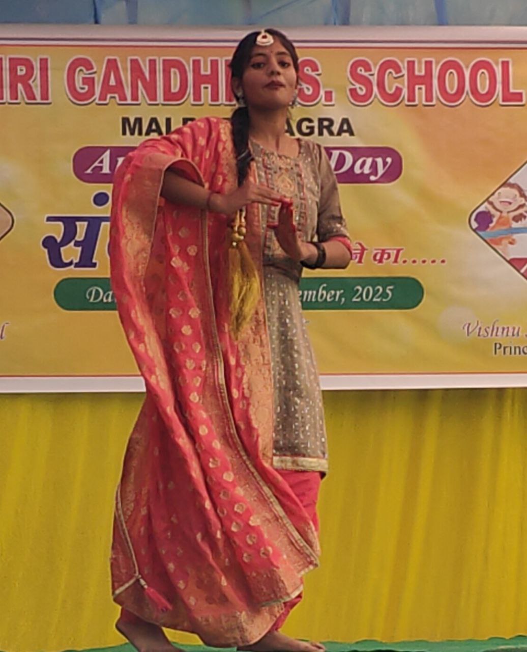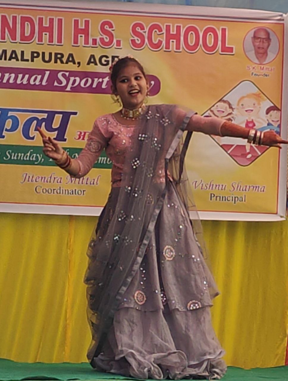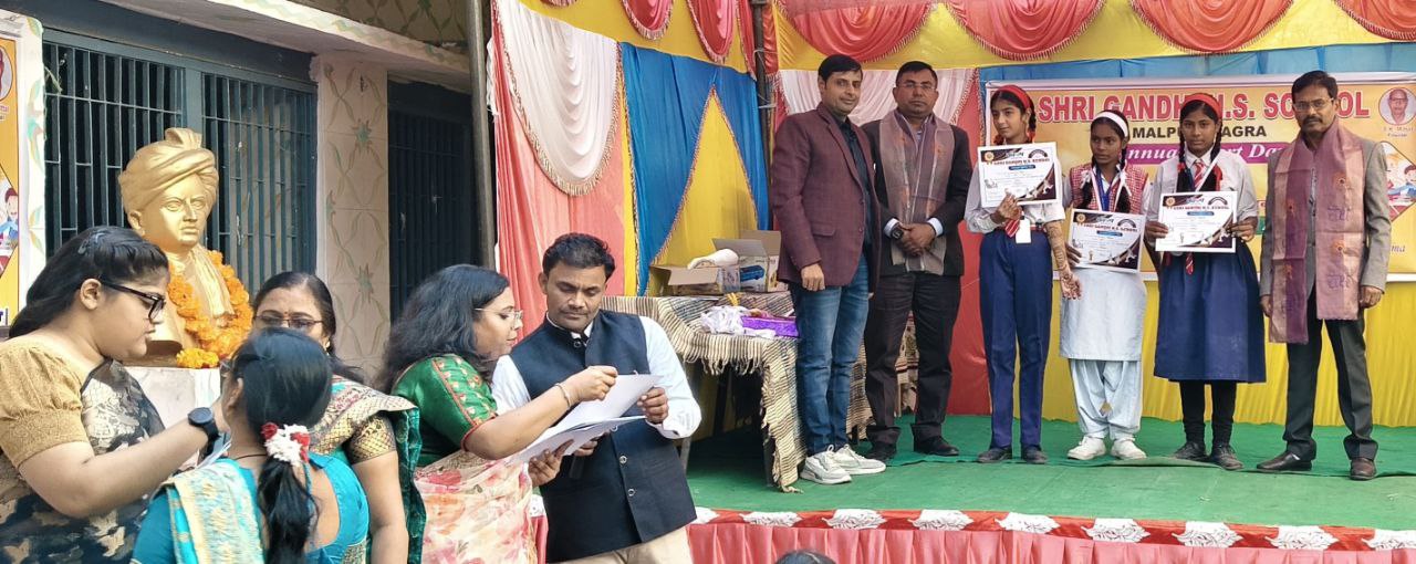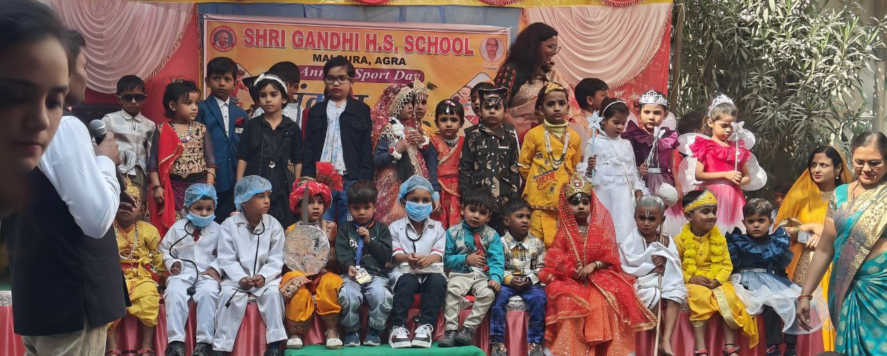 Agra, Uttar Pradesh, India, Bharat. आगरा- जगनेर रोड पर श्री गांधी हायर सेकेंडरी स्कूल मलपुरा है। आगरा की ओर से चलें तो मलपुरा थाने से थोड़ा से आए बाएं हाथ पर सड़क से थोड़ा अंदर जाकर है। स्कूल का 41वां वार्षिकोत्सव का समापन समारोह भव्यता से मनाया। बच्चों ने नृत्य की शानदार प्रस्तुतियां दीं। विविध वेश प्रतियोगिता में जब बच्चे कान्हा, राधा, सीता, झांसी की रानी, टीचर, डॉक्टर, सुदामा, भारत माता, परी आदि के वेश में आए तो हर कई अपलक देखता रह गया।