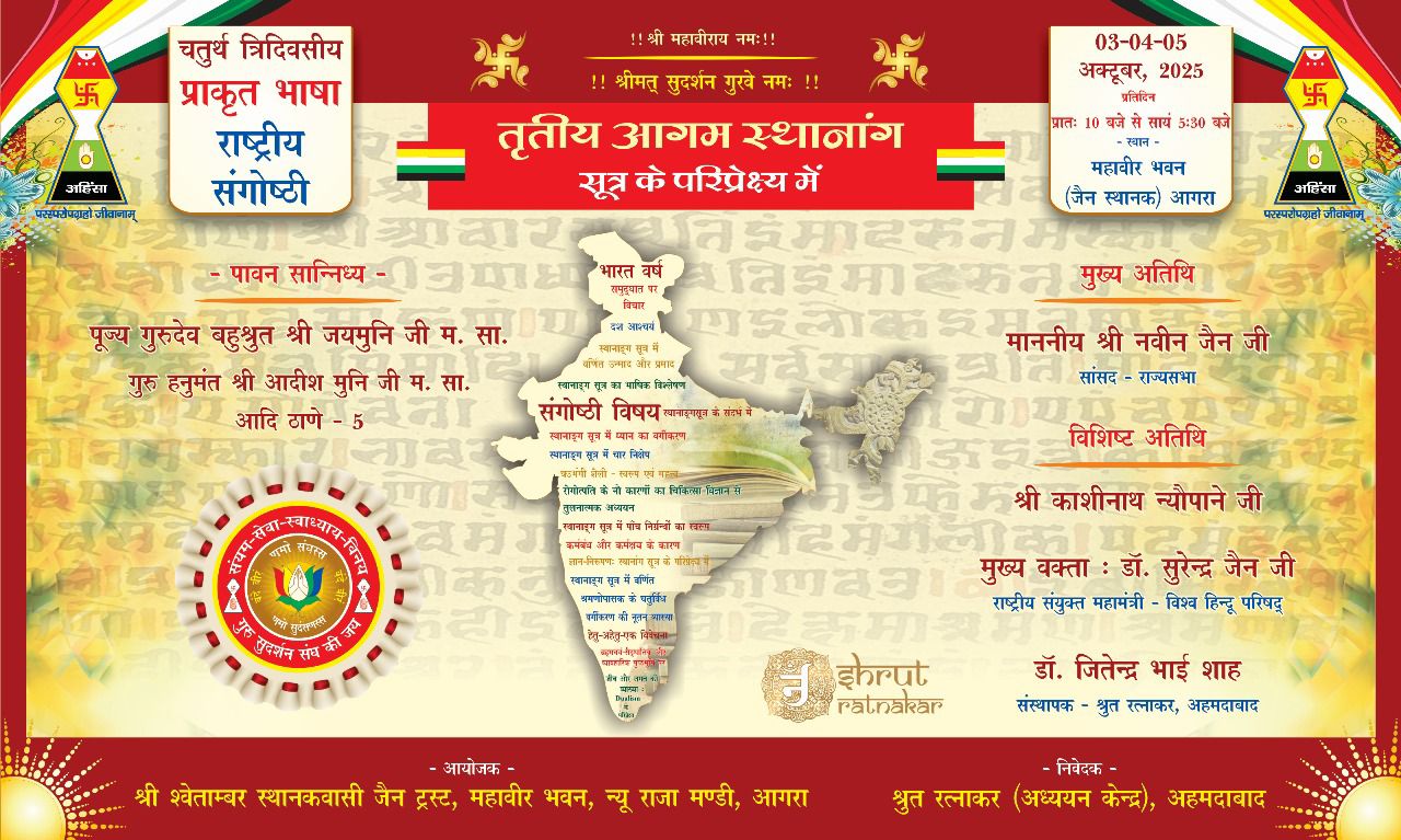 आगरा: भारत की प्राचीन जनभाषा प्राकृत को पुनर्जीवित करने और उसके गूढ़ ज्ञान को आधुनिक संदर्भ में प्रस्तुत करने के उद्देश्य से तीन दिवसीय चतुर्थ राष्ट्रीय प्राकृत संगोष्ठी का आयोजन 3 से 5 अक्टूबर तक महावीर भवन, जैन स्थानक, न्यू राजा की मंडी कॉलोनी, आगरा में किया जा रहा है। यह पहली बार है जब आगरा इस स्तर की प्राकृत संगोष्ठी की मेज़बानी कर रहा है।