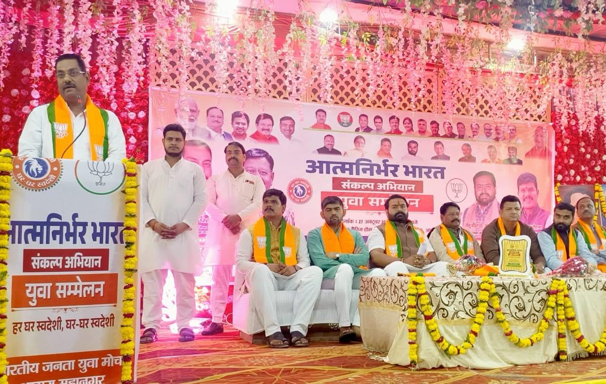 आगरा। आत्मनिर्भर भारत संकल्प यात्रा के तहत भारतीय जनता युवा मोर्चा (भाजयुमो) महानगर आगरा की ओर से सोमवार को दक्षिण विधानसभा के मारुति स्टेट, बोदला रोड स्थित मंगलम मैरिज होम में भव्य युवा सम्मेलन कार्यक्रम का आयोजन किया गया। कार्यक्रम की अध्यक्षता भाजयुमो महानगर अध्यक्ष शैलू पंडित ने की।