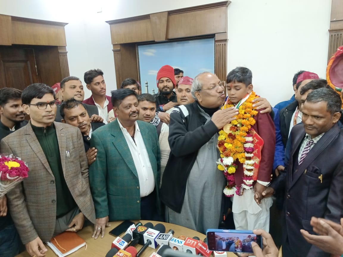 आगरा: उत्तर प्रदेश सरकार के मत्स्य विभाग के मंत्री डॉ. संजय कुमार निषाद ने गुरुवार को आगरा स्थित सर्किट हाउस में बाह क्षेत्र के बासौनी अंतर्गत गांव झरनापुरा निवासी वीर बालक अजय राज निषाद को सम्मानित किया। इस अवसर पर उनके पिता वीरभान को भी सम्मान प्रदान किया गया। मंत्री ने अजय राज को साफा पहनाकर, मेडल व माला अर्पित कर उसके अदम्य साहस की भूरि-भूरि प्रशंसा की।