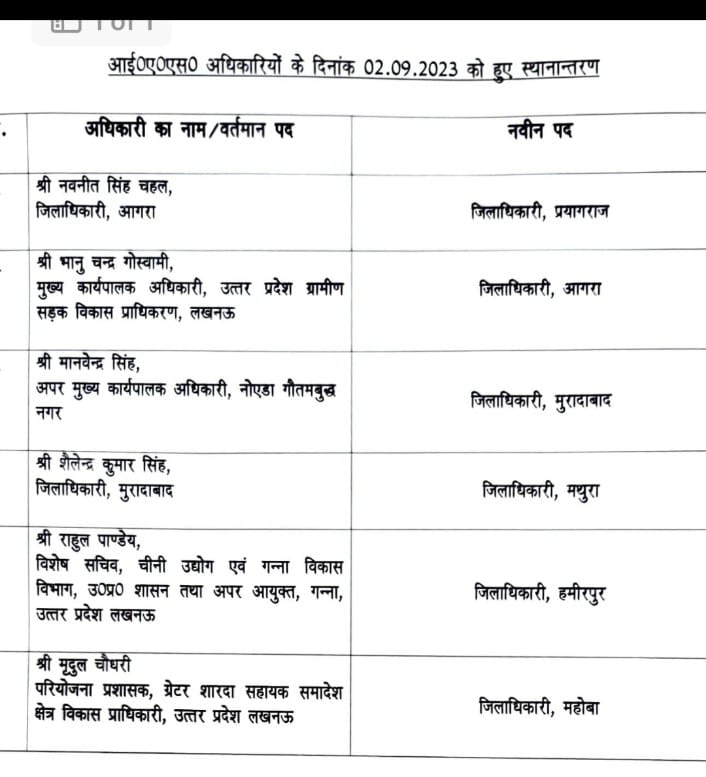 तबादले की इस लिस्ट में नोएडा के अपर मुख्य कार्यपालक अधिकारी पद पर तैनात मानवेन्द्र सिंह अब मुरादाबाद के जिलाधिकारी बनाए गए हैं. वहीं मुरादाबाद के डीएम शैलेन्द्र कुमार सिंह का तबादला अब मथुरा के डीएम पद पर हो गया है. वहीं अपर आयुक्त गन्ना के पद पर तैनात राहुल पांडेय का तबादला डीएम हमीरपुर के रूप में हुआ है. इस लिस्ट में 6वें आईएएस अधिकारी ग्रेटर शारदा सहायक समादेश क्षेत्र विकास अधिकारी मृदुल चौधरी को अब महोबा का जिलाधिकारी पद सौंपा गया है.